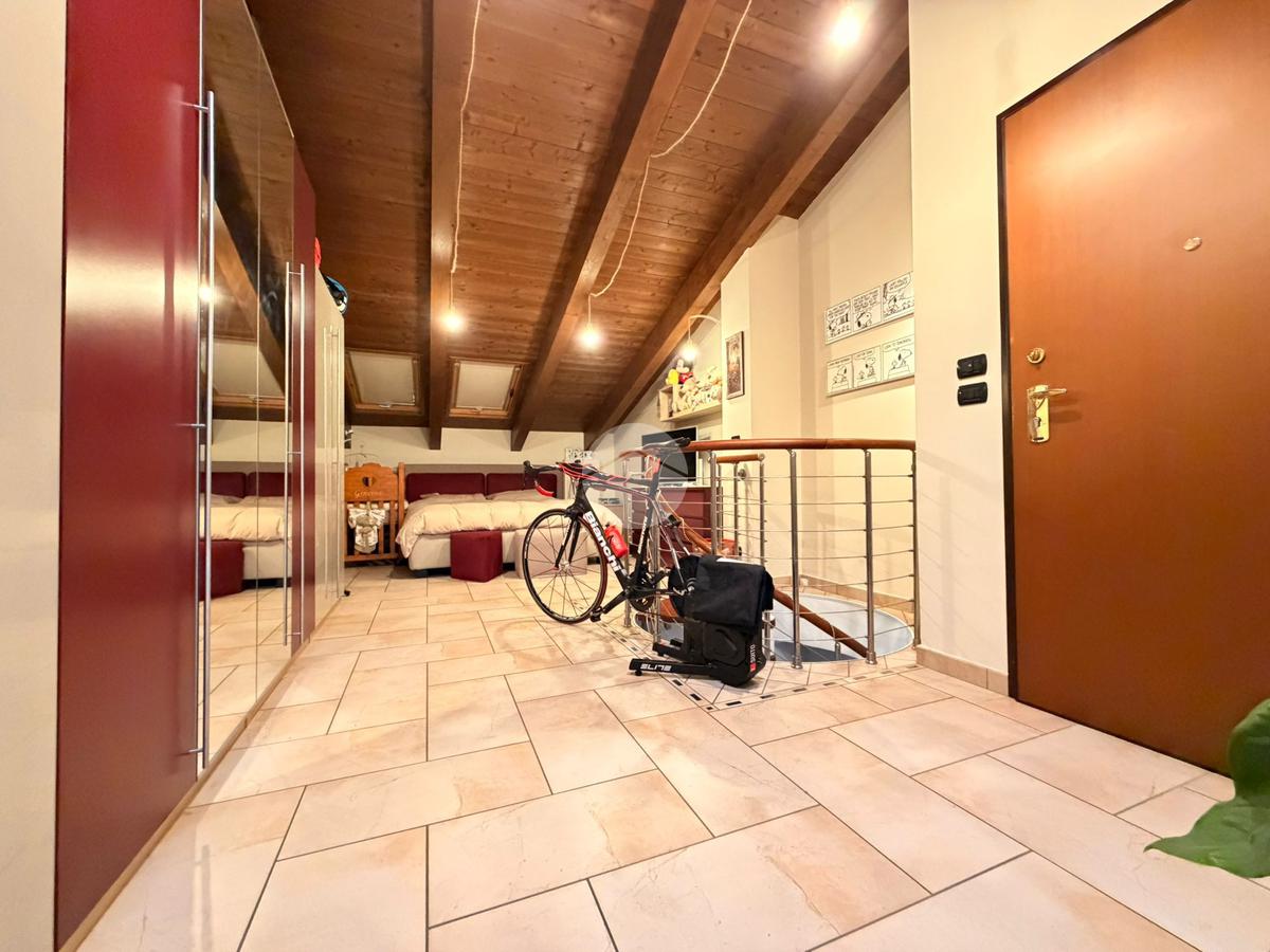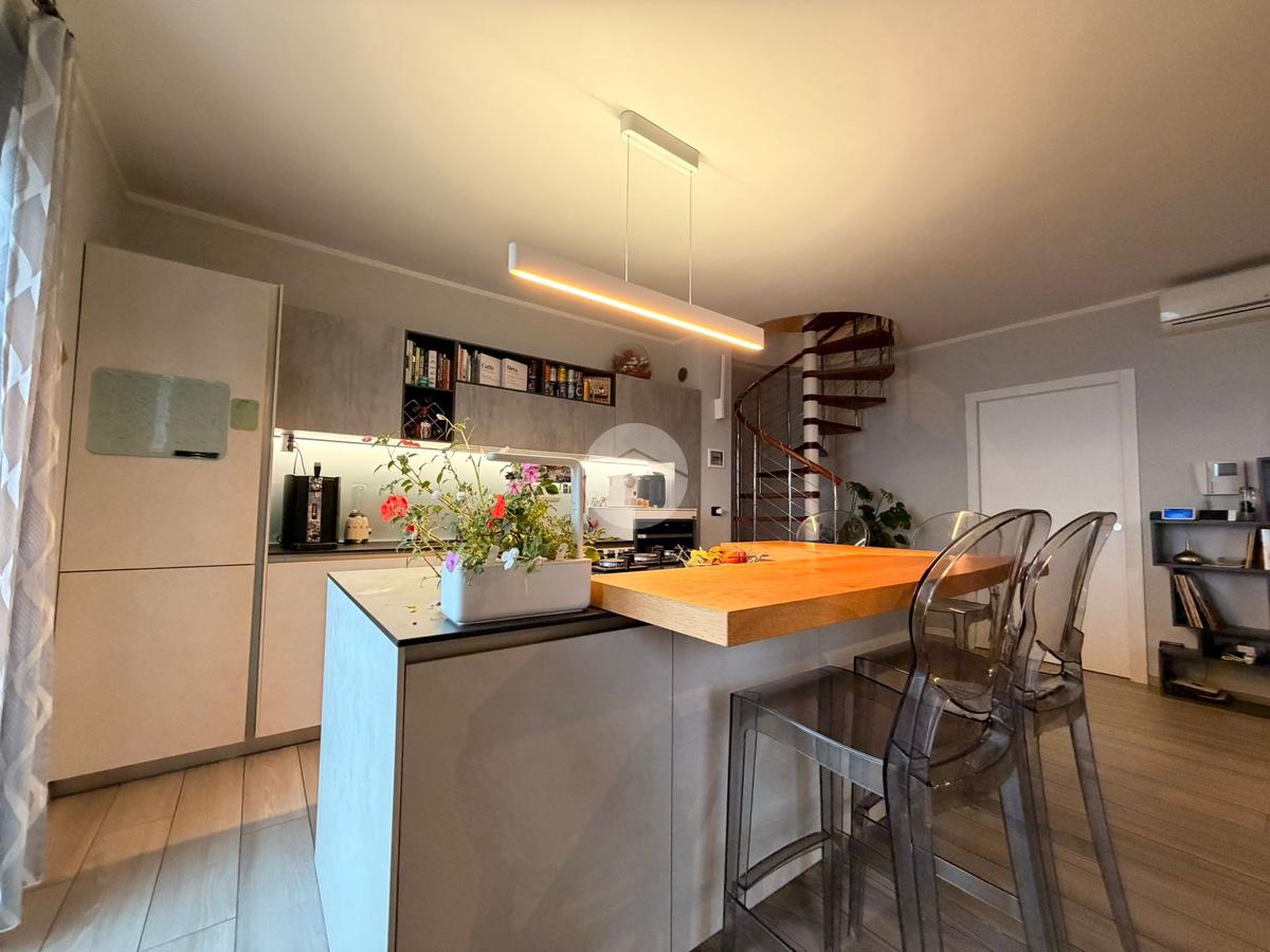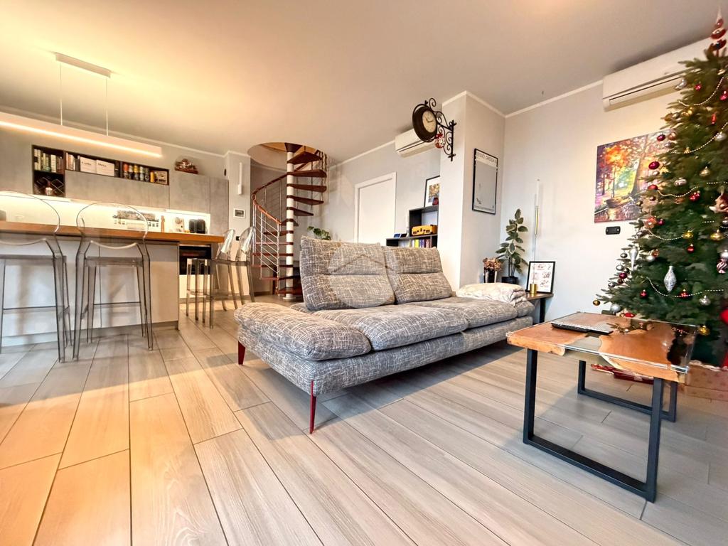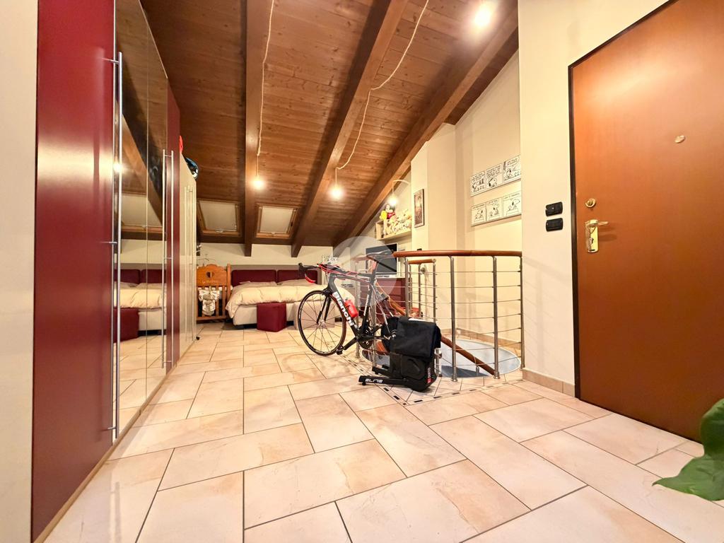 L’abitazione si sviluppa al piano principale con un ampio e luminoso soggiorno living con cucina a vista, una camera da letto, un bagno e due balconi che garantiscono ottima luminosità e piacevoli sfoghi esterni. Una scala interna accompagna al piano mansardato, caratterizzato da travi a vista che donano calore e charme agli ambienti.