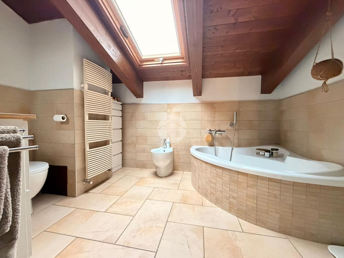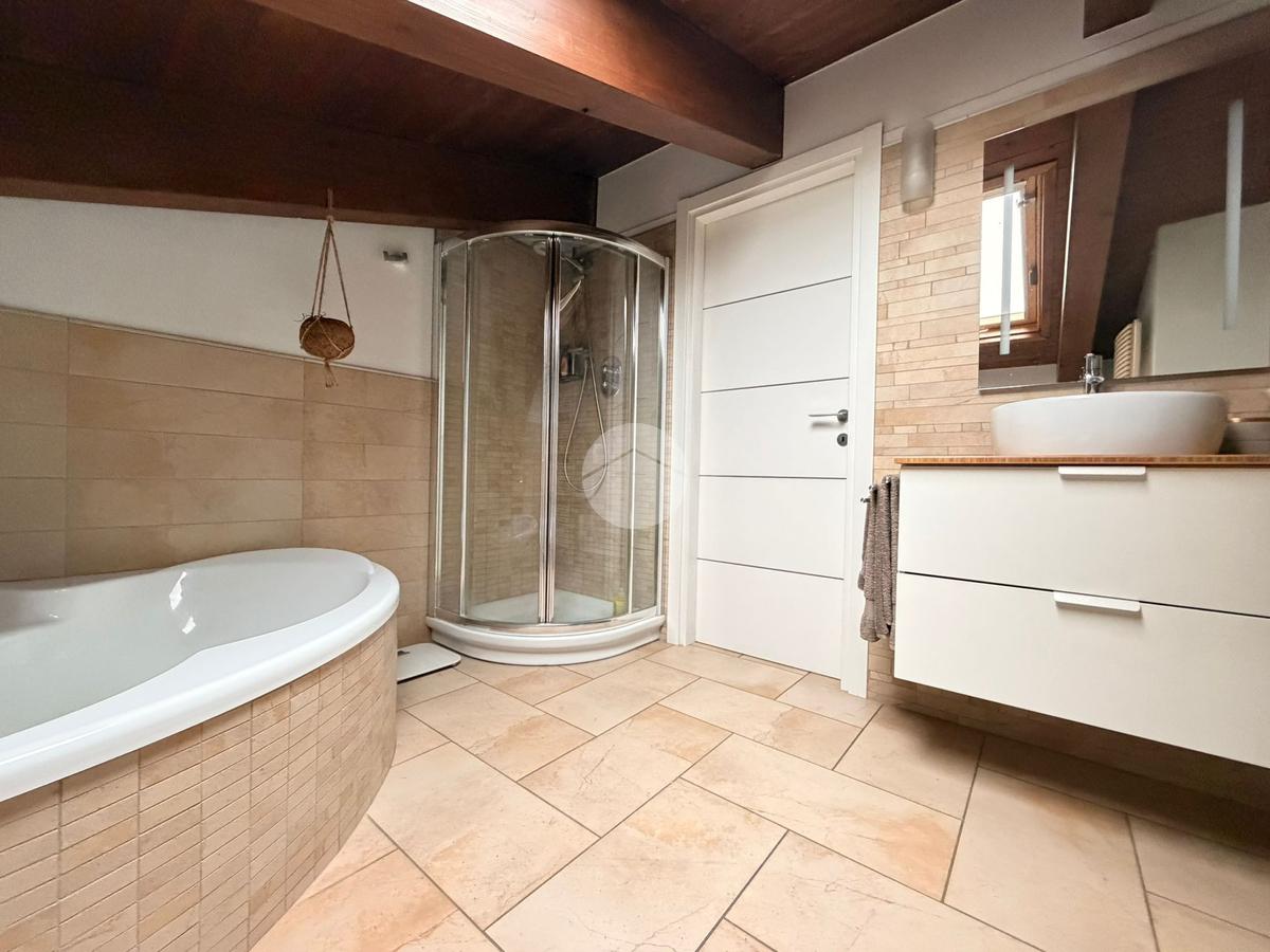 Qui trova spazio una camera matrimoniale, un disimpegno e un bagno finestrato con vasca idromassaggio, anch’esso impreziosito dalle travi a vista, creando uno spazio intimo e rilassante.